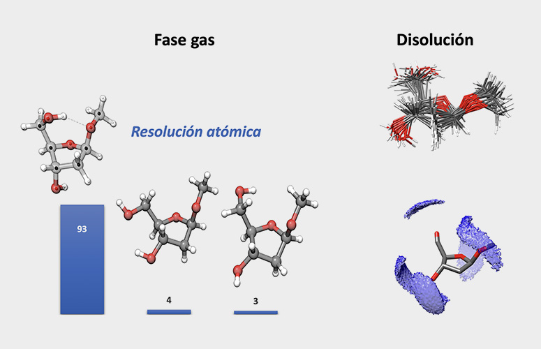 Una de las principales dificultades que tuvieron que superar fue la gran variabilidad y flexibilidad entre las diferentes formas o conformaciones que pueden adoptar las moléculas de 2-desoxirribosa. Los átomos que conforman estas moléculas de azúcar se pueden organizar formando anillos de cinco miembros, o formando anillos de seis miembros. “En la naturaleza, las formas biológicas presentan anillos de cinco miembros, pero en los experimentos, al aislar completamente el azúcar, y apartarlo de cualquier disolvente y sin interactuar con el resto de elementos que conforman el ADN y condicionan su configuración, la forma más estable de azúcares que conseguíamos era la de anillos de seis miembros”, explica Cocinero.