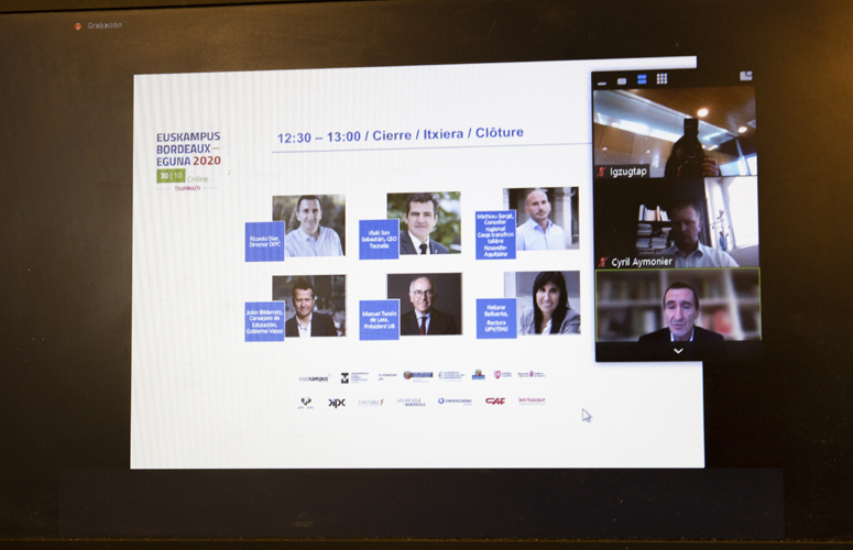 Hoy se ha celebrado el Euskampus-Bordeaux Eguna 2020, la gran cita anual en la que se presentan y comparten los últimos logros y avances conseguidos por el Campus Transfronterizo Euskampus-Bordeaux y sus Polos de Conocimiento, dedicados a la investigación puntera orientada a grandes retos científicos, tecnológicos y sociales. Por primera vez el evento se ha realizado online, dadas las circunstancias sanitarias.