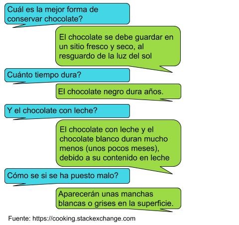 Uno de los dominios de conversación del proyecto son preguntas sobre cocina y alimentación, donde se están recogiendo conversaciones como la siguiente, basada en la información existente en el foro https://cooking.stackexchange.com (ver imagen adjunta).