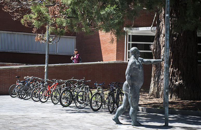 Una figura masculina, hoy diríamos con sobrepeso, sosteniendo un poste en equilibrio. ‘Equilibrio’, ese es precisamente el nombre de esa escultura de bronce situada junto a la Escuela de Ingeniería de Vitoria-Gasteiz. Un equilibrio perpetuo desde que fue instalada en ese lugar tras obtener el primer premio de Escultura en la calle, dentro certamen Vitoria-Arte Gasteiz. La obra de Benito Valladares forma parte de aquella iniciativa cuyo objetivo fue enriquecer la geografía de la capital alavesa con piezas escultóricas a finales del siglo pasado.