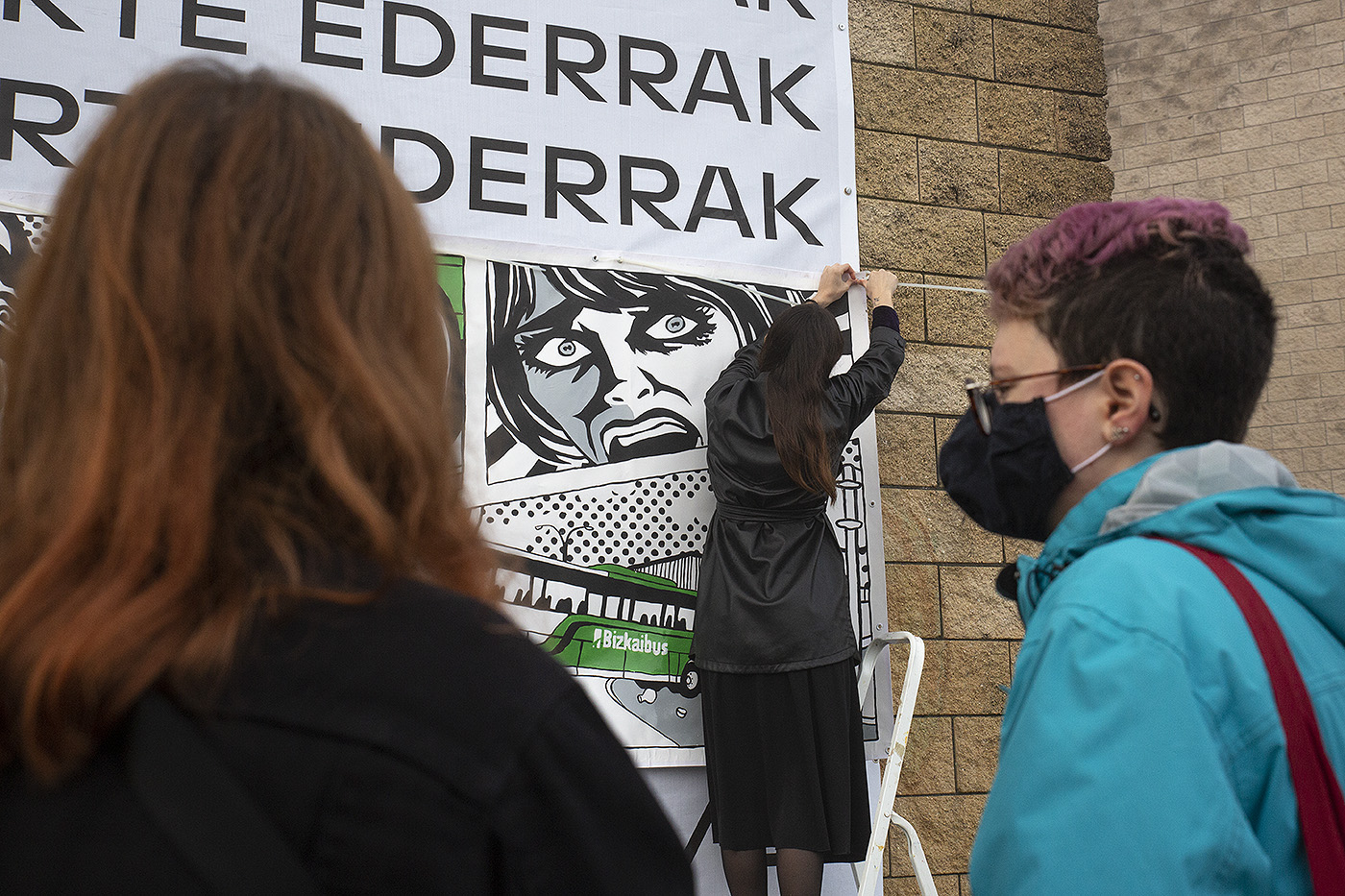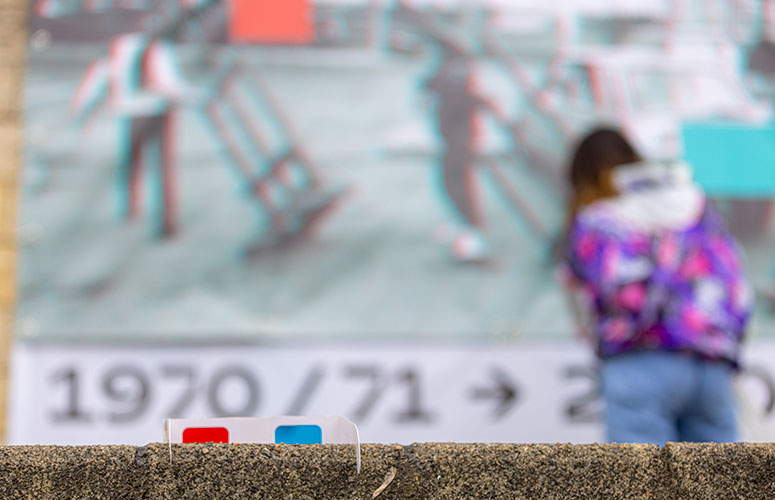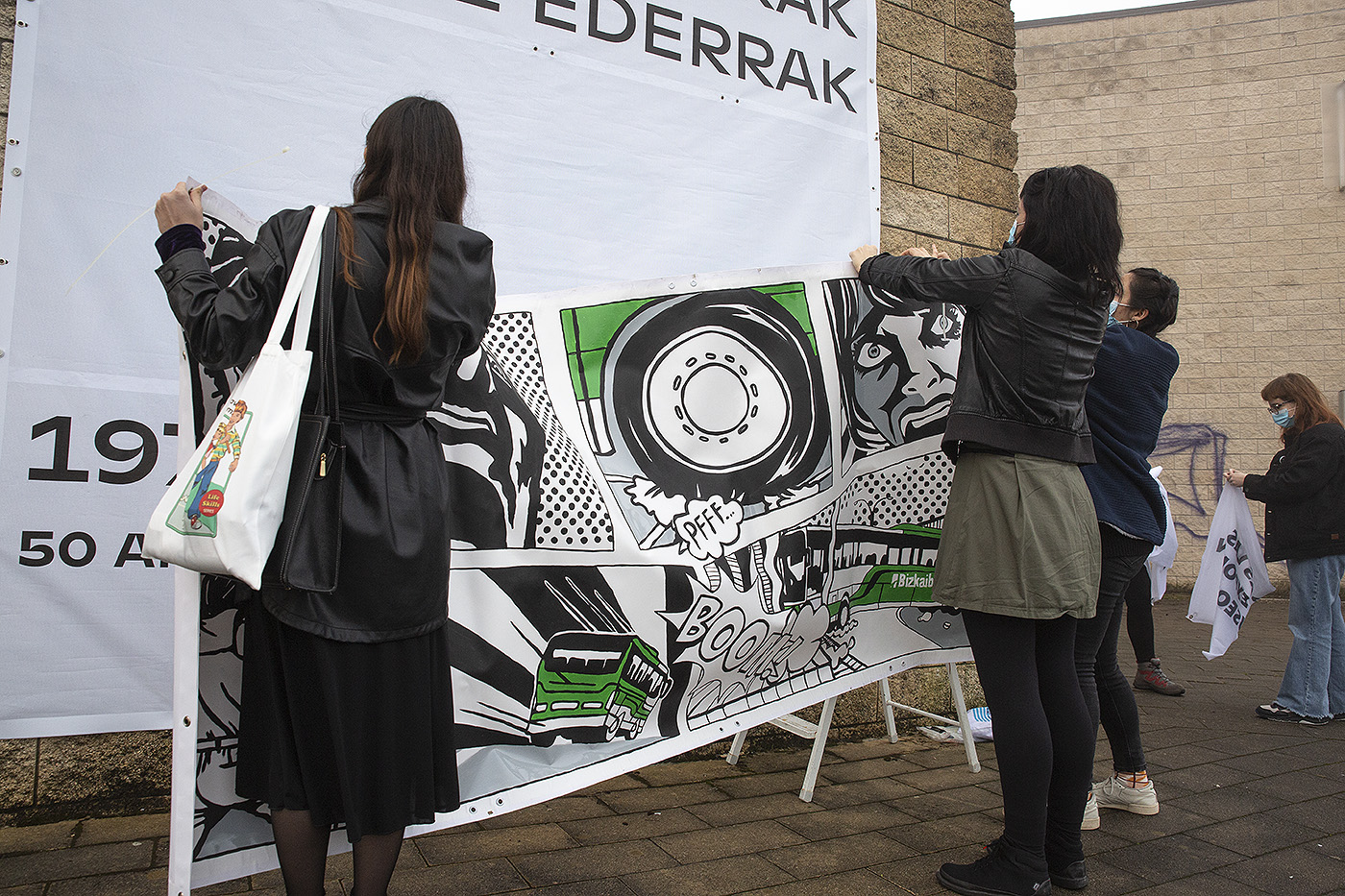 La Facultad de Bellas Artes continúa celebrando su 50 aniversario con un nuevo cambio de lona en su fachada. El profesor Daniel Tamayo y las alumnas ‘Las Vecinas’ (Sandra Cadenas y Eva Ruiz) fueron los primeros intervinientes, y hoy, 'Ama Lauzaroak' (Maialen Porroy e Itxaso Navarro) han dado el relevo a Sara Berasaluce y su foto de 1985 en 3D: se han necesitado gafas especiales para ver esta imagen del Archivo Municipal de Bilbao que muestra a estudiantes de la Facultad trasladando caballetes. Su autor original es Imanol García Sáez, fotógrafo del rotativo 'La Gaceta del Norte'.