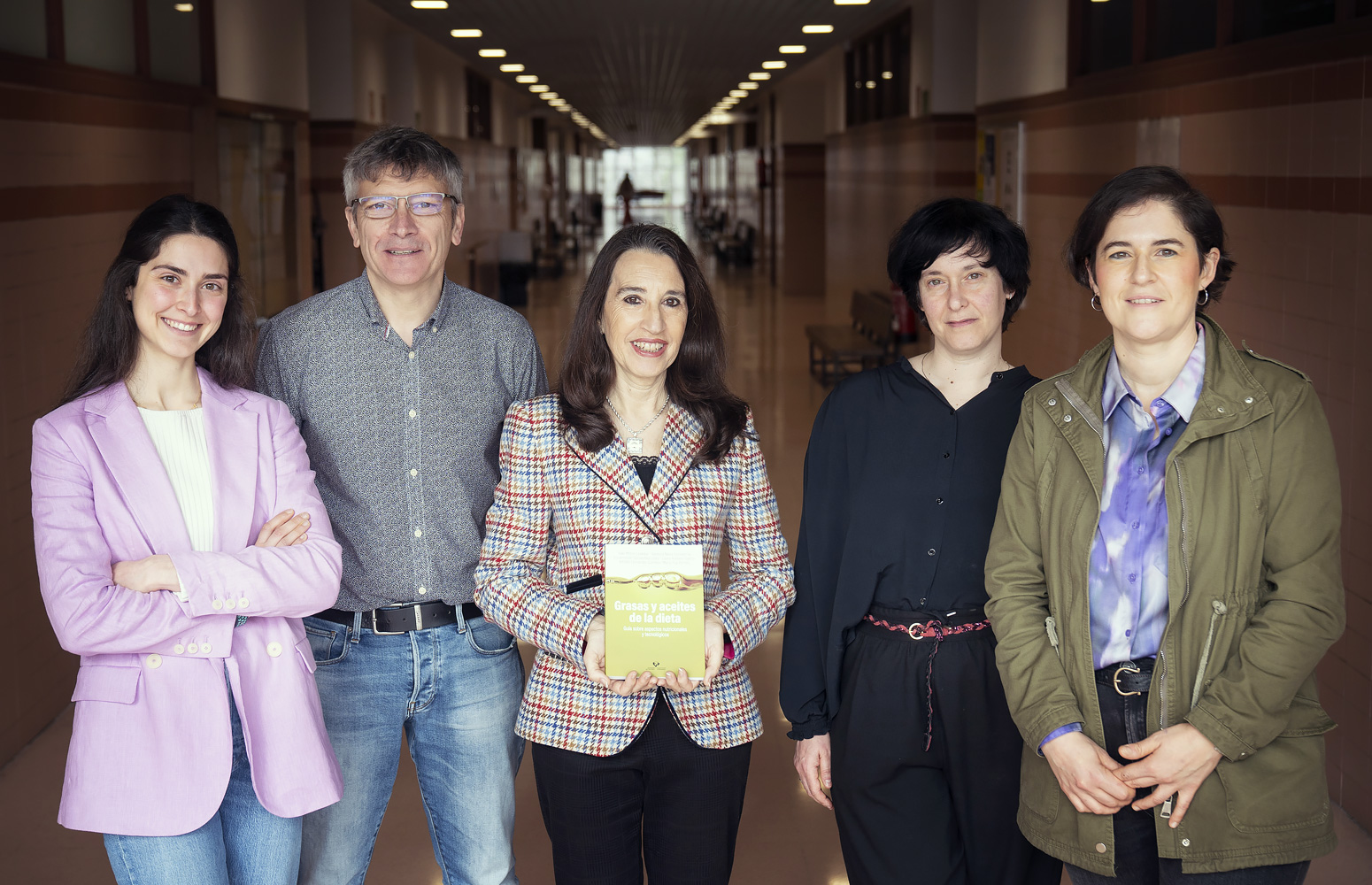 El Servicio editorial de la Universidad del País Vasco ha publicado ‘Grasas y aceites de la dieta. Guía sobre aspectos nutricionales y tecnológicos’, fruto del trabajo de los investigadores del grupo Nutrición y Obesidad, Iñaki Milton-Laskibar, Laura Arellano-García, Alfredo Fernández-Quintela y María Puy Portillo, miembros también del CIBERobn Instituto de Salud Carlos III y del Instituto de Investigación Sanitaria Bioaraba, en colaboración con Barbara Nieva-Echevarría y Encarnación Goicoechea-Osés, investigadoras del grupo Procesado, Calidad y Seguridad de Alimentos (PROCAYSEAL). Ambos grupos de investigación se encuentran en del Departamento de Farmacia y Ciencias de los Alimentos de la Facultad de Farmacia de la UPV/EHU.