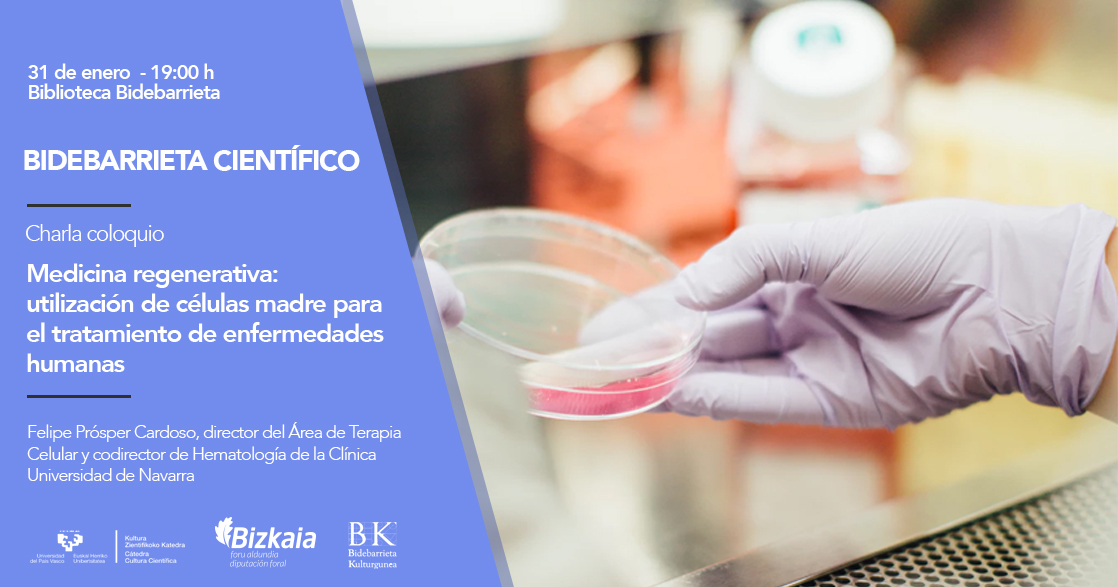 Pero, ¿cuáles son los principios científicos que justifican la utilización de estos medicamentos y las dificultades regulatorias y científicas a las que hay que hacer frente para llevarlos a la práctica clínica? El doctor Felipe Prósper Cardoso, director del Área de Terapia Celular y codirector de Hematología de la Clínica Universidad de Navarra, abordará las realidades y los retos de futuro de las terapias celulares en una conferencia titulada “Medicina regenerativa: utilización de células madre para el tratamiento de enfermedades humanas”, que se celebrará el día 31 de enero, a las 19:00 de la tarde, en la Biblioteca Bidebarrieta de Bilbao (Calle Bidebarrieta, 4).