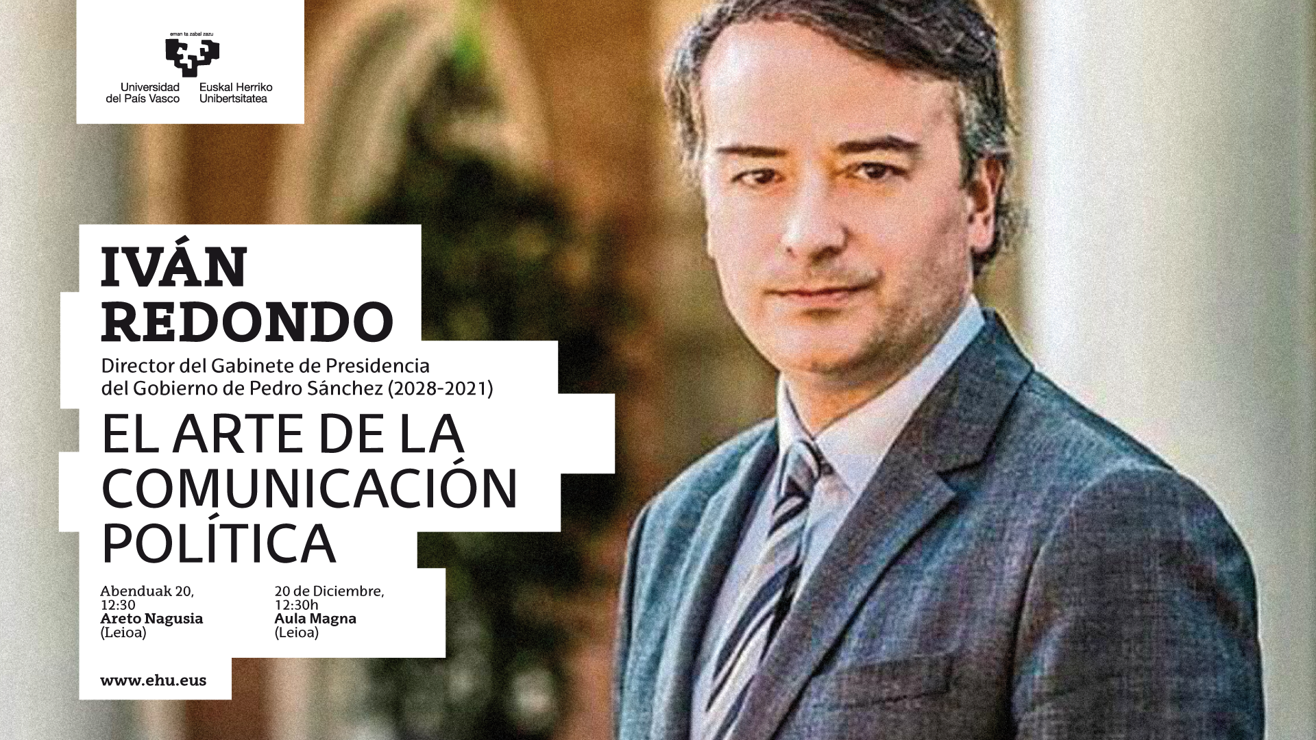 El miércoles, 20 de diciembre, a las 12.30 en el Aula Magna de la Universidad del País Vasco, el exdirector del gabinete de Presidencia de Pedro Sánchez, Iván Redondo, impartirá una conferencia titulada “El arte de Comunicar”.