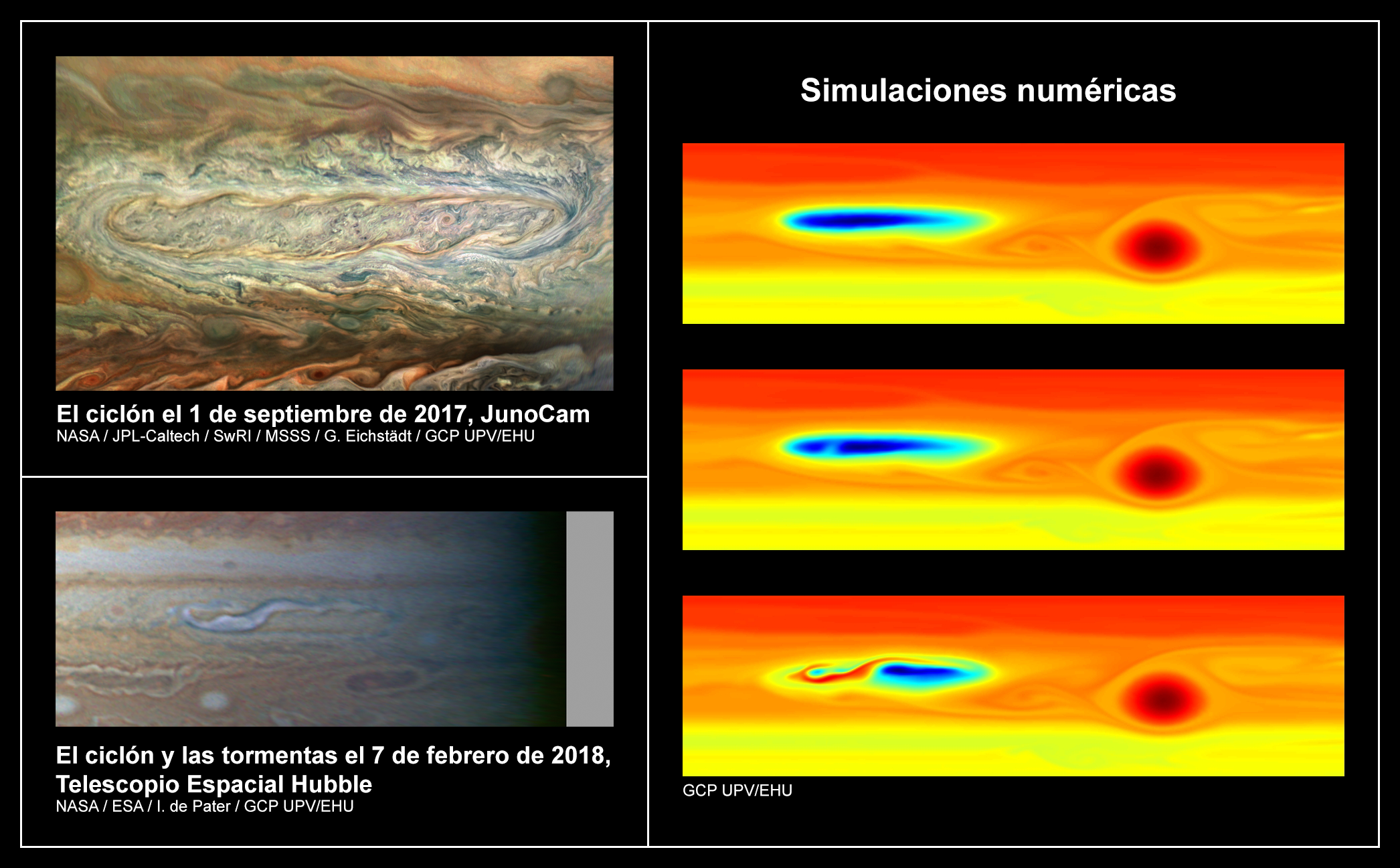 Al mismo tiempo que han analizado las numerosas imágenes obtenidas, han realizado simulaciones numéricas tanto del ciclón como de la perturbación que sufrió éste como consecuencia de las tormentas. Utilizaron para ello un modelo numérico de circulación atmosférica adecuado a las características de la atmósfera de Júpiter. Una de las características que quisieron determinar mediante las simulaciones fue la naturaleza de las tormentas, es decir, cuánta energía liberaron las tormentas y cuál fue la fuente de esta energía. En las tormentas convectivas los movimientos producidos son consecuencia de la energía que se libera en la condensación de los diferentes gases que pasan a formar las nubes en expansión observadas. “Los candidatos más importantes eran el amoniaco, principal componente de las nubes visibles del planeta, y el agua, mucho más profunda en la atmósfera y difícil de observar —relata Iñurrigarro—. Mediante las simulaciones fuimos capaces de calcular la energía que debíamos introducir en el sistema simulado para reproducir el fenómeno. Y a través de esa energía suministrada a las estructuras atmosféricas, determinamos que la única fuente posible era la condensación de agua, porque la condensación de agua libera muchísima más energía que la del amoniaco. Entonces, simplemente por comparación, vimos que la cantidad que necesitaríamos de amoniaco para generar esa energía suministrada era imposible de obtener, porque se requeriría recolectar el amoniaco de un área muy superior a la del propio ciclón en el que se produjo la actividad de las tormentas.