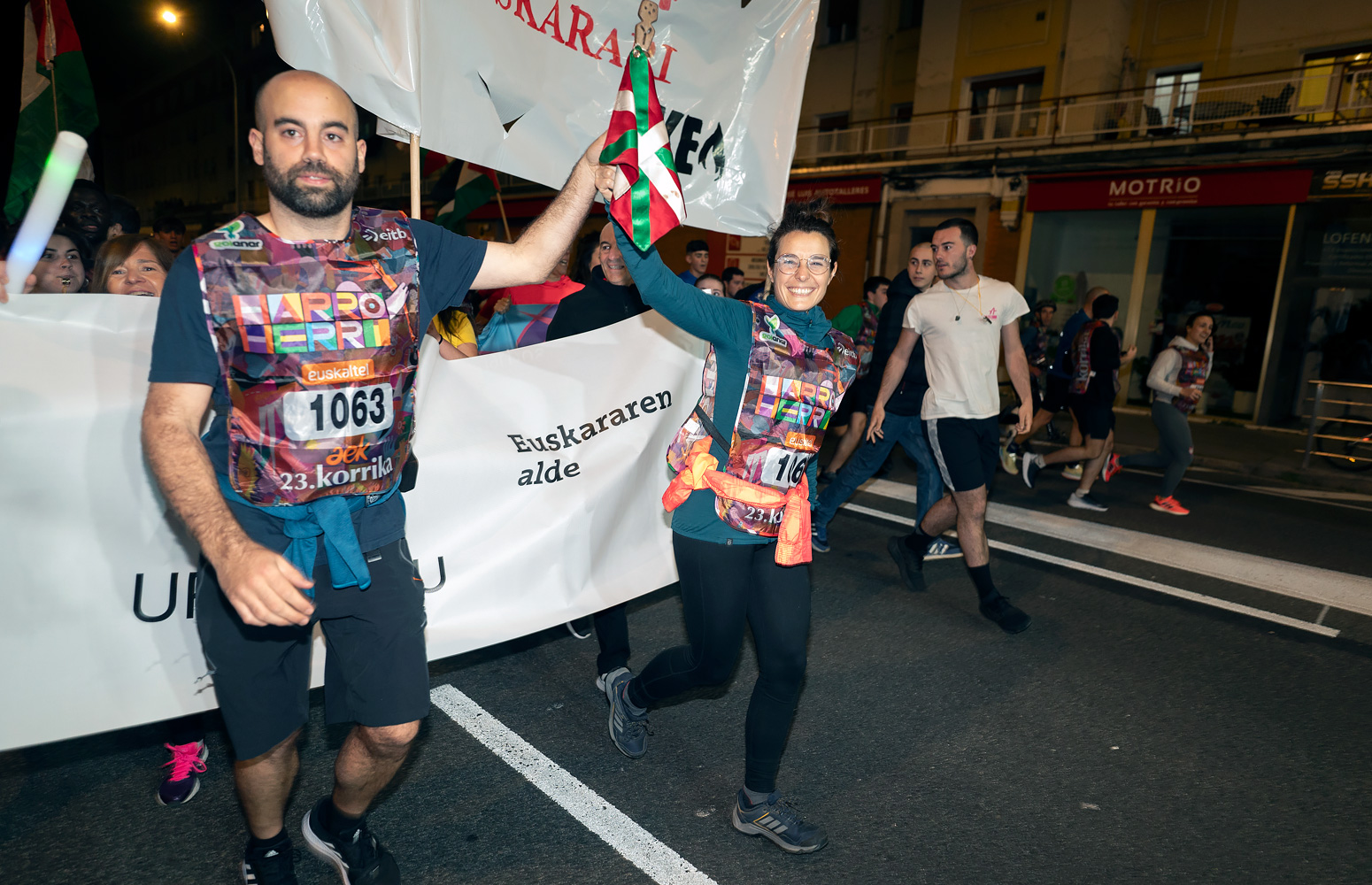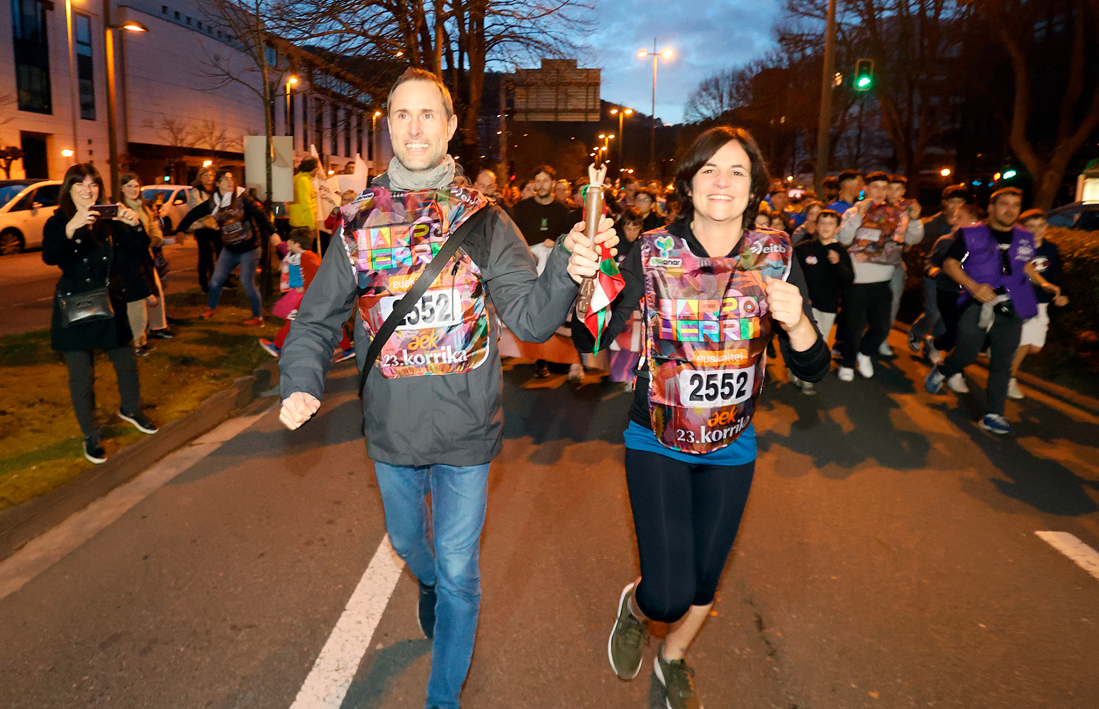 El sábado, 23 de marzo, la Korrika recorrió las calles de Donostia. Natalia Alonso Alberca, profesora de la Facultad de Psicología, y Rafael Martín Talaverano, docente de la Escuela Técnica Superior de Arquitectura, fueron los encargados de encabezar el kilómetro en representación de la comunidad universitaria de la UPV/EHU.