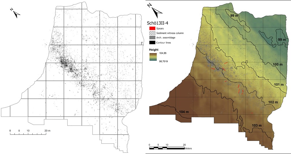 Plano de la excavación de Schöningen 13II-4 y distribución espacial de los restos de fauna en el ‘Horizonte de las lanzas’ (Spear Horizon). A la derecha topografía en la que se aprecia como el lago ganaba en profundidad. Nota, cada cuadrado representa una superficie de 10x10 m. -