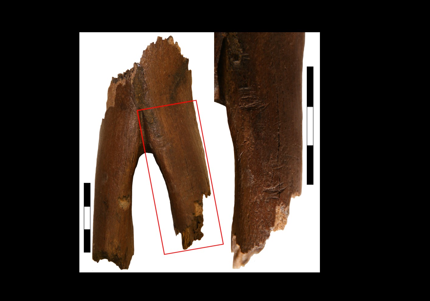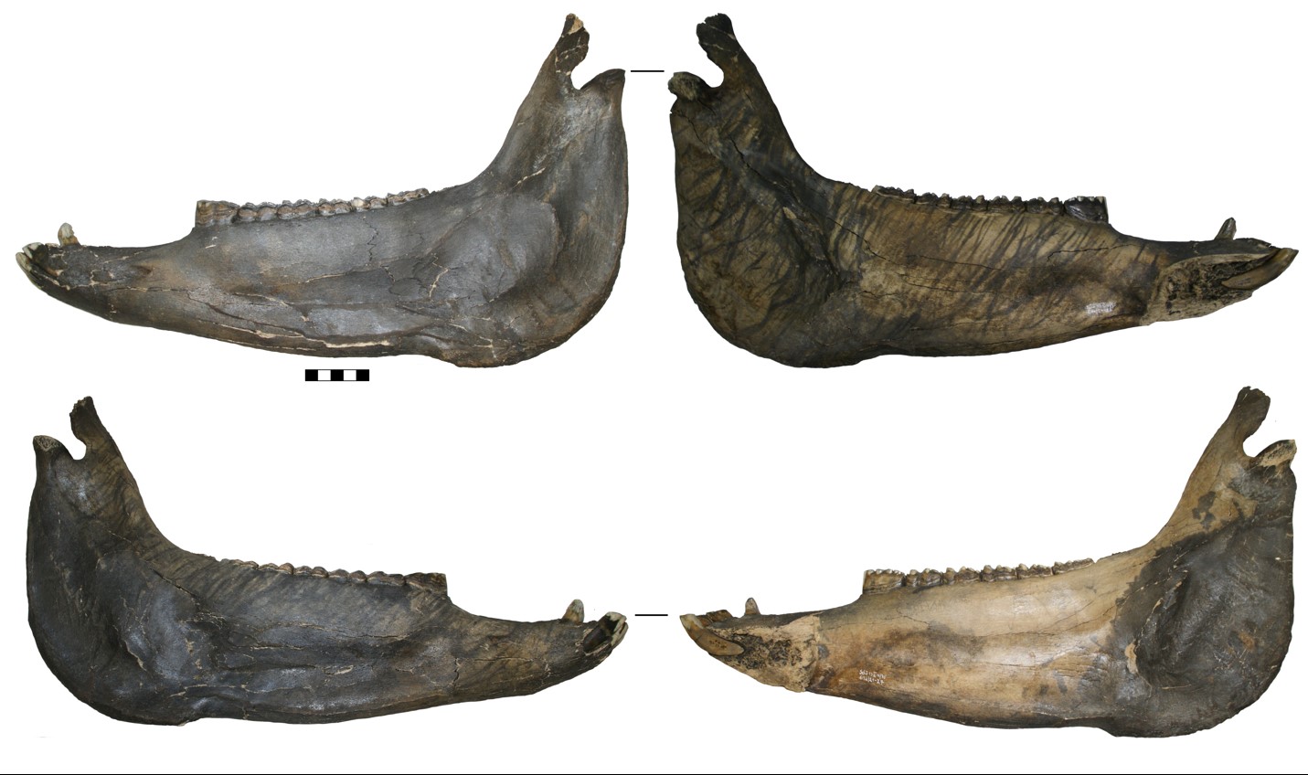 Vista ventral de una mandíbula de ‘Equus mosbachensis’ (ID 11036) con marcas de corte, hechas con el objetivo de despellejar al animal. La escala está en centímetros.