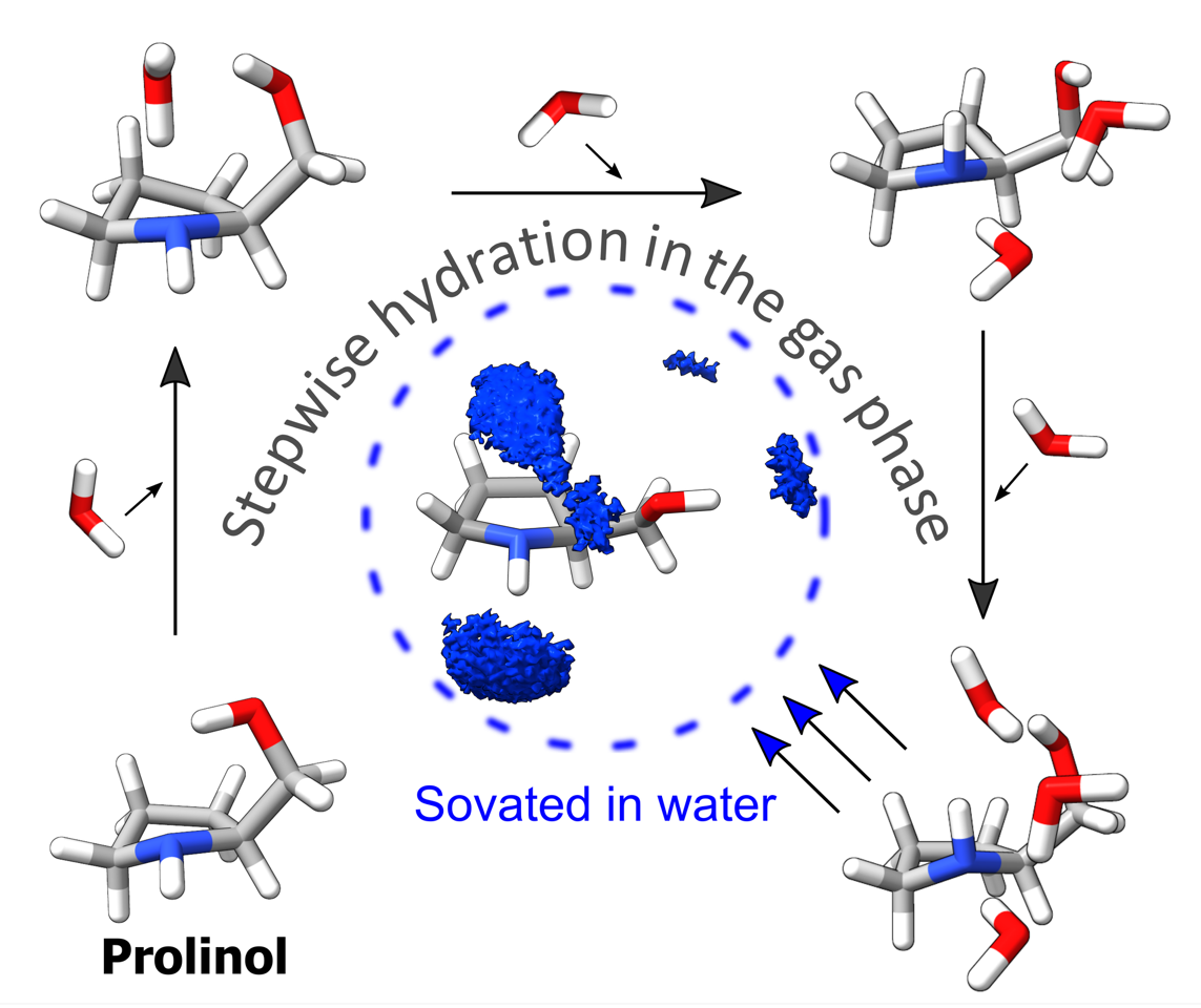 Una investigación desarrollada por el Grupo de Espectroscopía de la EHU y del Instituto Biofisika (CSIC/EHU), y publicada en la prestigiosa revista Journal of the American Chemical Society, ha analizado la hidratación gradual del prolinol, una molécula utilizada ampliamente como catalizador y como bloque de construcción en síntesis química. El estudio demuestra que unas pocas moléculas de agua son capaces de cambiar completamente la estructura preferida del prolinol.