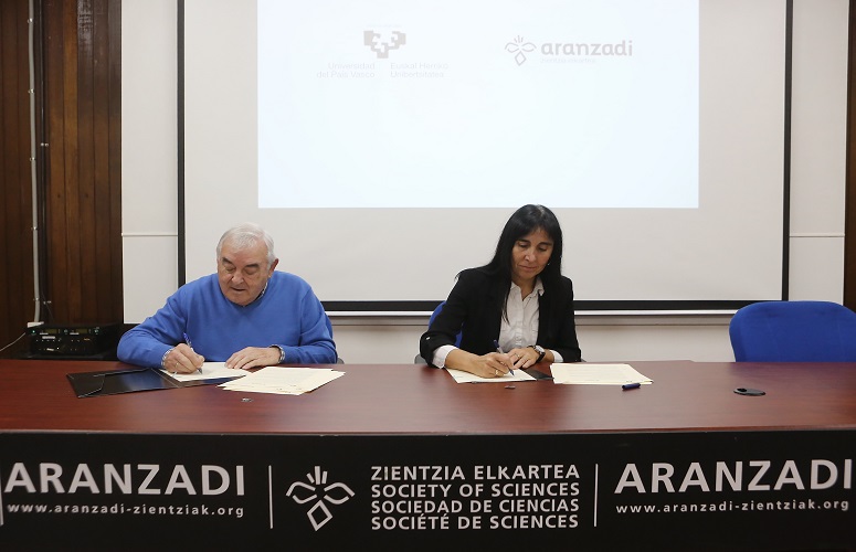 La rectora de la Universidad del País Vasco, Nekane Balluerka Lasa, y el presidente de la Sociedad Aranzadi, Jokin Otamendi, han firmado hoy un convenio marco con el fin de establecer la colaboración por parte del personal investigador de ambas entidades. Las dos instituciones ya firmaron en 2004 un acuerdo marco de colaboración, ya finalizado. El acuerdo que ahora se firma actualiza y refuerza la relación estrecha de colaboración ya existente entre la UPV/EHU y la Sociedad Aranzadi.