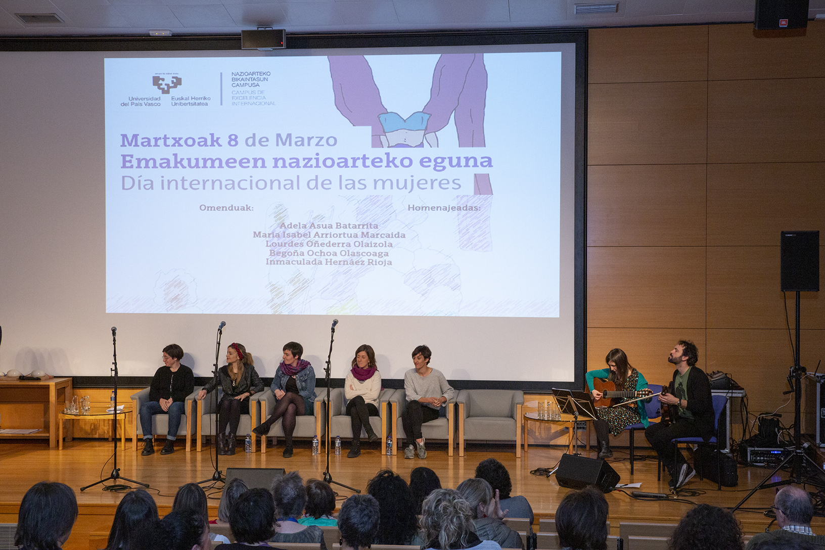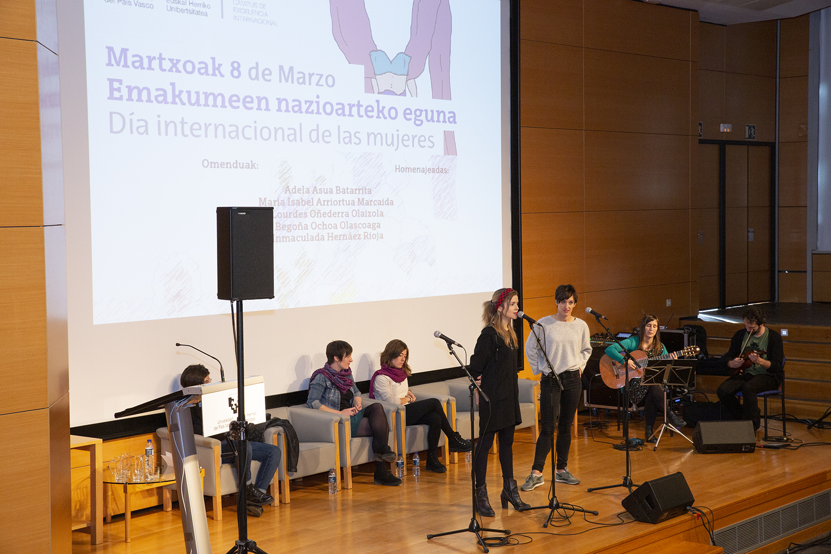 El acto, que ha tenido lugar en el Paraninfo de la Facultad de Ciencia y Tecnología de la UPV/EHU, ha contado con la presencia de la rectora de la UPV/EHU, Nekane Balluerka Lasa y la vicerrectora de Innovación, Compromiso Social y Acción Cultural, Idoia Fernández Fernández. Las bertsolaris Uxue Alberdi, Oihana Iguaran, Alaia Martín y Jone Uria han abierto el reconocimiento con la bertso-saio musical Ez da kasualitatea.