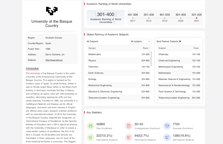 El ranking mide básicamente el impacto de la investigación de las universidades, así como su prestigio internacional. La Universidad del País Vasco apareció por primera vez en este ranking en 2012.