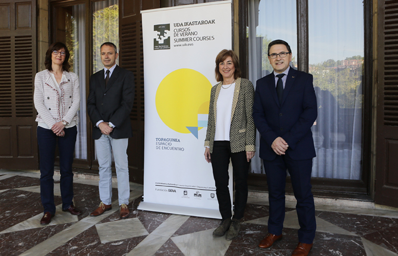 Cristina Uriarte, consejera de Educación del Gobierno Vasco, Agustin Erkizia, vicerrector del Campus de Gipuzkoa de la UPV/EHU, Roberto Iñiguez de Onsoño, director de personal de IRIZAR e Itziar Alkorta, directora de los Cursos de Verano de la UPV/EHU, han presentado la XXXVIII edición que comienza ya el próximo día 30 de mayo con actividades programadas hasta noviembre.