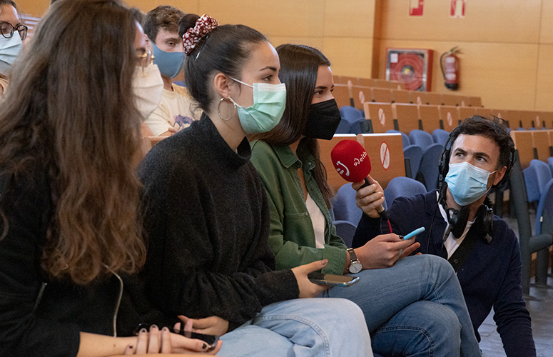 Mientras se retransmitía el programa radiofónico desde el Paraninfo, diez estudiantes de segundo de Periodismo vieron la película en la sala anexa y luego se incorporaron al improvisado estudio de RadioEuskadi, para dialogar con la auténtica Maixabel.