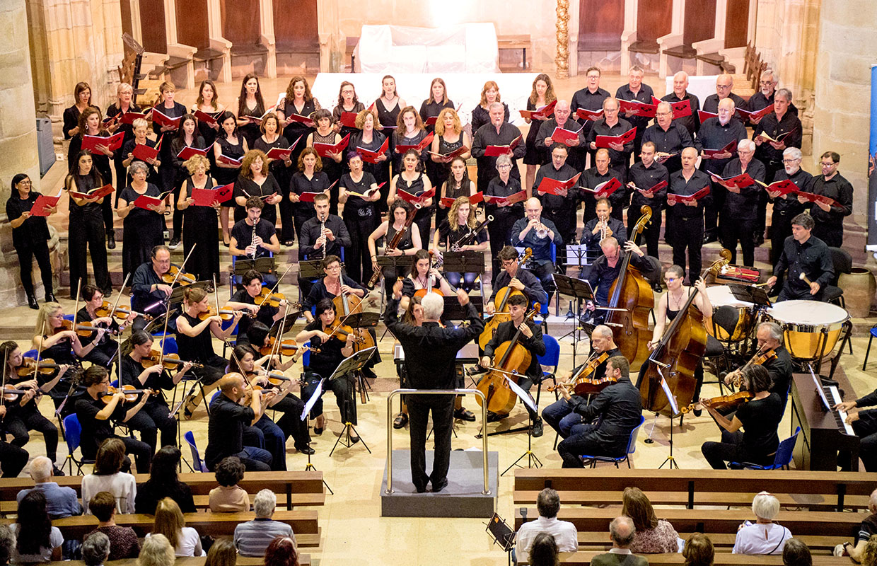 Con piezas de Mozart, Schubert, Zamfir y Mascagni, EHUorkestra y EHUabesbatza pusieron fin al curso 2022-2023 en un concurrido y aplaudido concierto en en la Iglesia de la Encarnación.