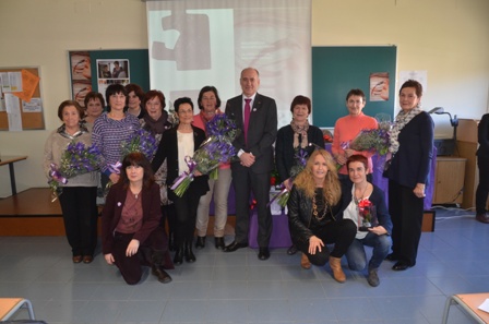 Tras la entrega de los galardones, las futuras maestras y maestros han homenajeado con un ramo de flores y un abrazo a las primeras alumnas y maestras pioneras de la Escuela de Magisterio vitoriana. De esta manera, con el abrazo entre generaciones, se quería visualizar la importancia de la labor de los maestros y las maestras.