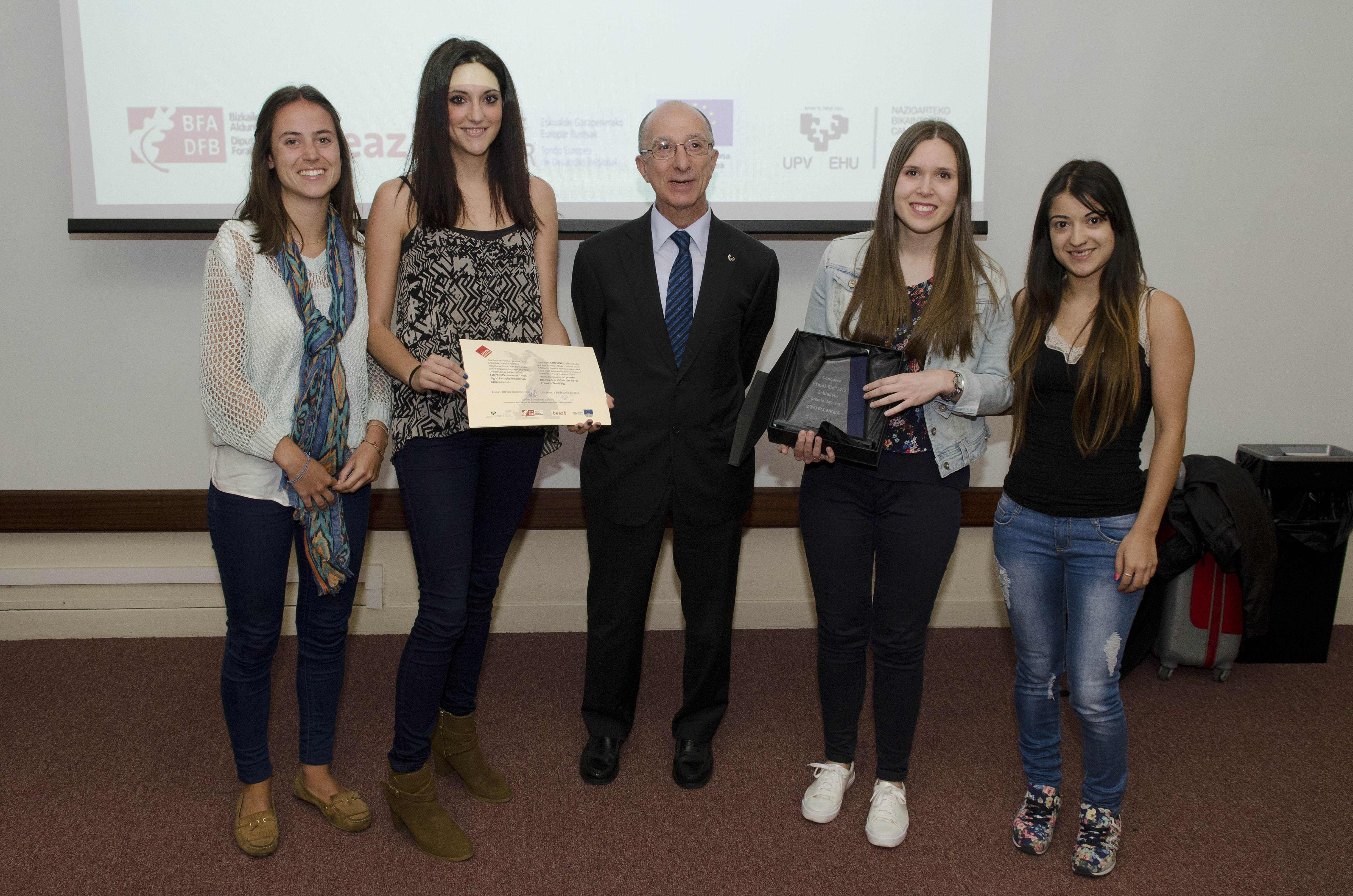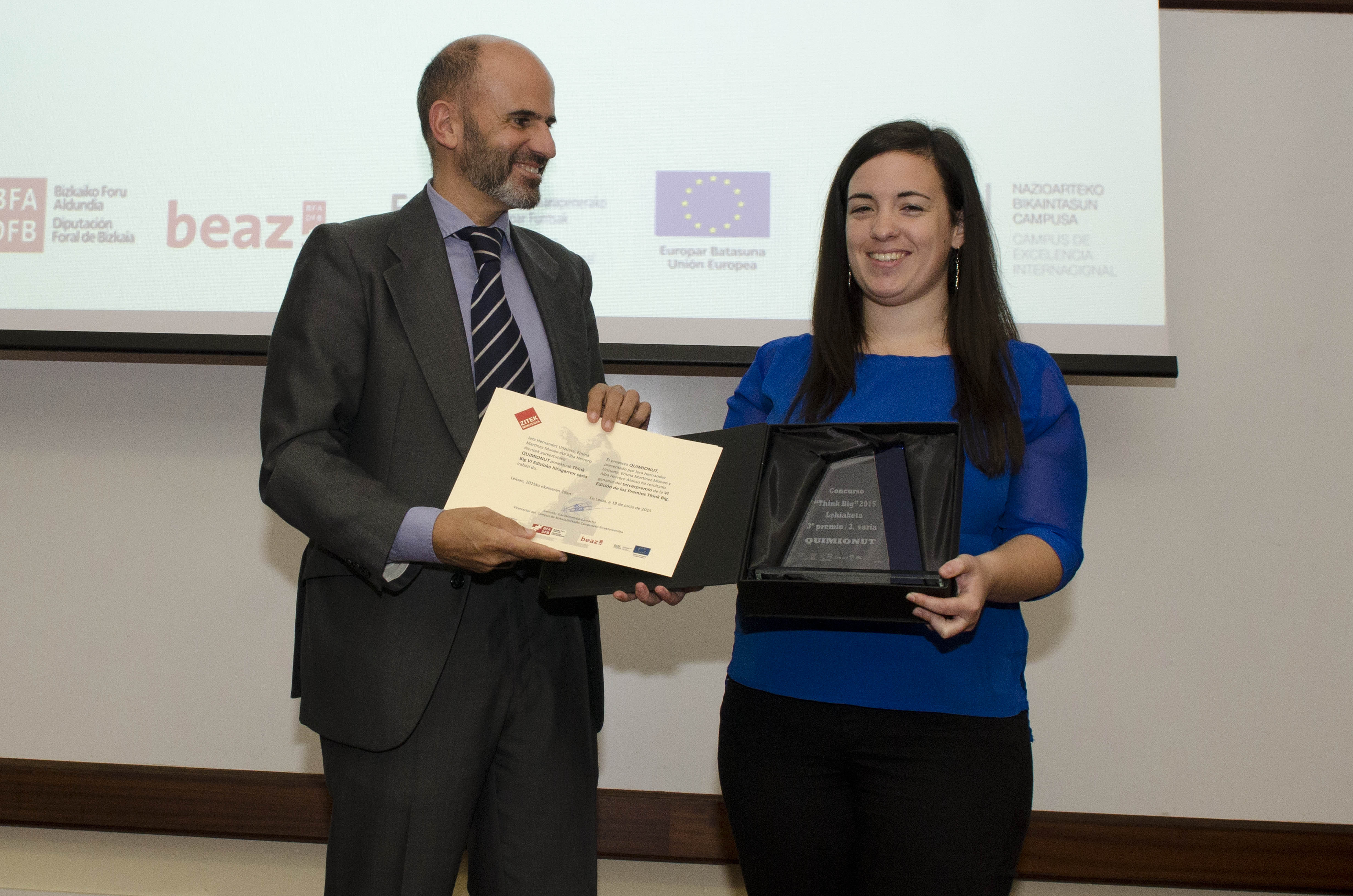 En el acto de entrega de premios han participado el vicerrector del Campus de Bizkaia, Carmelo Garitaonandia, el director de Relaciones Externas del citado campus, Aitzol Lamikiz, jefa de servicio de Promoción Empresarial de la Diputación Foral de Bizkaia, Eva Armesto, y el técnico de BEAZ, Juan Arrúe.