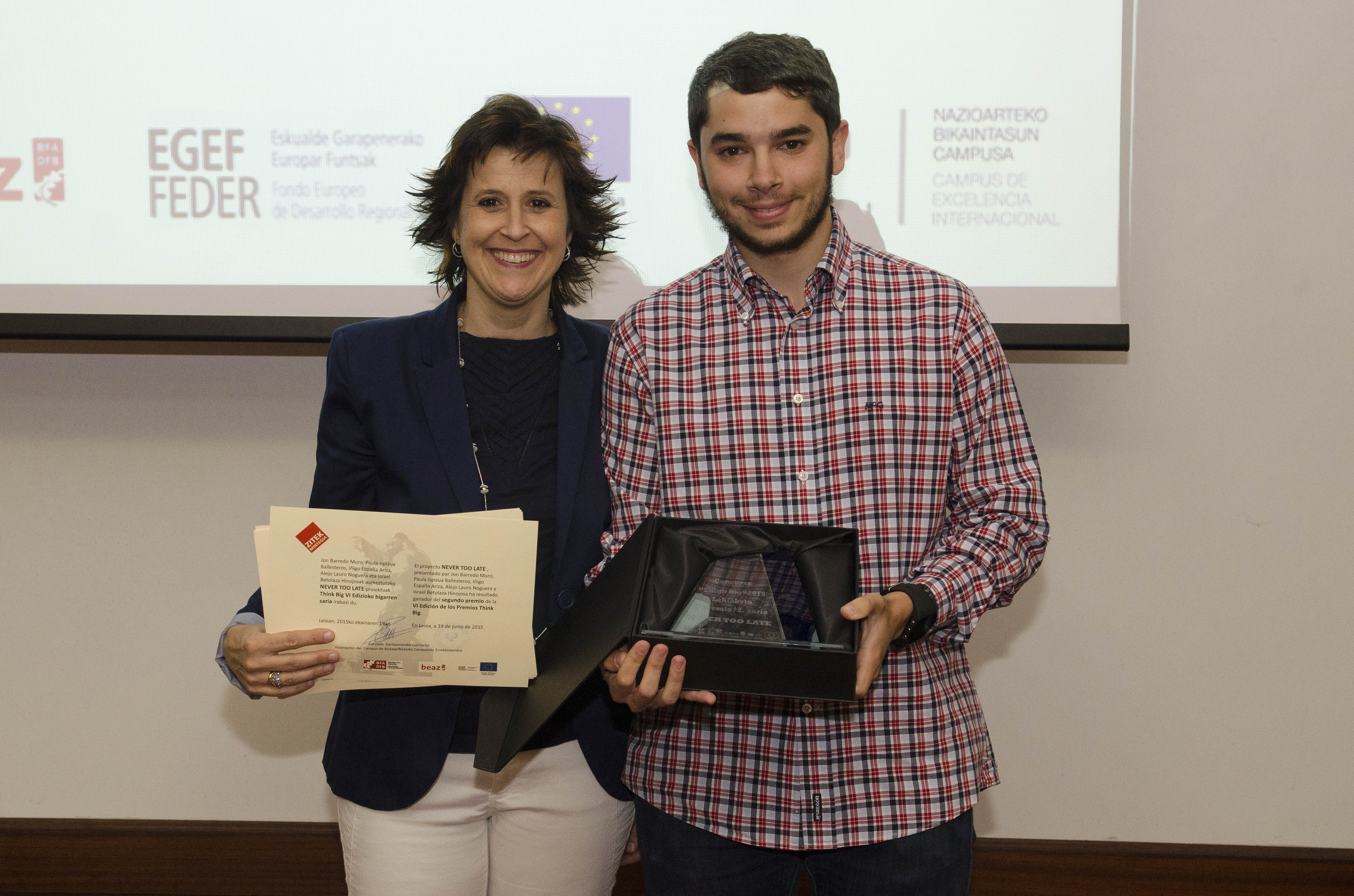 El segundo premio en dos proyectos: Ikastravelling y Never Too Late. Cada uno recibirá 1.000 euros de premio. Ikastravelling, de Los estudiantes de la Facultad de Ciencias Económicas y Empresariales Igor Anasagasti y Alexander Ramos, han creado Ikastravelling para ser intermediario entre agencias de viajes y estudiantes. Por su parte, Never Too Late ha sido desarrollado por Jon Barredo, Paula Ispizua, Iñigo España, Alejo Lauro e Israel Betolaza, estudiantes de las facultades de Ciencias Económicas y Empresariales, Psicología, Bellas Artes, y de la Escuela Técnica Superior de Ingeniería de Bilbao. La idea empresarial contempla la explotación de los deportes de riesgo y de montaña como un nicho de mercado.