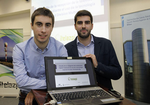 La radiodifusión de la televisión terrestre en el siglo XXI afronta el desafío de adaptarse a los nuevos hábitos de consumo, que demandan la recepción en movimiento y una mayor variedad y disponibilidad de contenidos. En plena sociedad de la información, el televisor pasa a un segundo plano y teléfonos móviles, ordenadores y tablets inundan el mercado, donde los consumidores cada vez exigen más servicios al instante. Y todo ello, cuando el rango de frecuencias asignado a la TV terrestre se va reduciendo, lo que obliga a investigar para conseguir un uso mucho más eficiente y flexible del espectro. A este reto han dado respuesta Gorka Pujana y Asier Fernández, dos titulados en el Grado en Ingeniería en Tecnología de Telecomunicación de la Escuela de Ingeniería de Bilbao, con sendos estudios relacionados con la recepción de la televisión terrestre utilizando la novedosa tecnología LDM (Layered Division Multiplexing). Sus proyectos han sido distinguidos con el Premio Itelazpi, que galardona al mejor Trabajo Fin de Grado en el campo de las Telecomunicaciones.