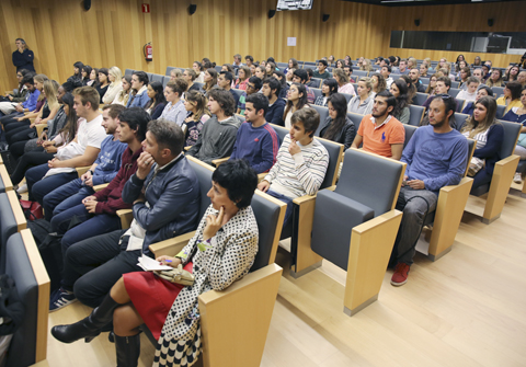El acto de bienvenida da comienzo con un video introductorio sobre Euskadi y sus gentes. Tras las intervenciones protocolarias, reciben consejos sobre seguridad, servicios universitarios, ocio y cultura. Los asistentes escuchan a los oradores en silencio, atentos a sus palabras y expectantes. No hay preguntas al final del acto. Solo sonrisas y ganas de fiesta. Ya, en un momento previo al acto, cuando han posado para la fotografía de grupo, han comenzado a conocerse entre sí. Hay un buddy que busca con ahínco a la persona que guiará y cuidará durante su estancia en la Universidad del País Vasco y los medios de comunicación se afanan en entrevistar a los protagonistas de la jornada, jóvenes procedentes de países tales como Canadá, Japón, Singapur, Uruguay, Polonia, República Checa, Ucrania y Estados Unidos que, a su regreso a su país de origen se convertirán en los embajadores de la UPV/EHU en el mundo y harán realidad el lema de la Universidad: eman ta zabal zazu (dalo y difúndelo). Pero eso ahora queda lejos, ahora es el momento de sentirse acogidos, de empezar a estudiar y, sobre todo, de disfrutar.