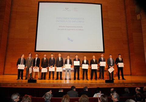 Por primera vez, los titulados de los cuatro antiguos centros que la componen recibieron juntos sus diplomas en un acto presidido por la rectora de la UPV/EHU, Nekane Balleurka, y que contó con la asistencia de la consejera de Educación del Gobierno Vasco, Cristina Uriarte y el concejal de Planificación Urbana del Ayuntamiento de Bilbao, Asier Abaunza, entre otras autoridades institucionales, académicas y representantes de empresas punteras con las que la Escuela mantiene convenios de colaboración.