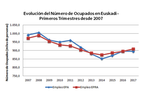 El Informe Laboral Euskadi del 1º trimestre de 2017 muestra también los datos de evolución de ocupados en cada primer trimestre desde hace 10 años (2007), tanto con la información de la EPRA (Encuesta de la Población en Relación con la Actividad), realizada desde EUSTAT; como con la de la EPA (Encuesta de Población Activa), que realiza el INE (Instituto Nacional de Estadística). De la Rica explica que han considerado necesario añadir esta comparativa en el informe por el ruido que trimestre a trimestre "aparece al confrontar" los datos de la EPA con los de la EPRA. "Al margen de algunas discrepancias puntuales entre ambas fuentes, que provienen de las diferencias en las muestras utilizadas, ambas fuentes marcan una tendencia muy similar: el empleo cae suavemente desde 2008 hasta 2011, acelera su caída hasta 2014, para comenzar a partir de ese momento con una ligera recuperación. Ambas series muestran que es necesario recuperar unos 100.000 empleos más para alcanzar los niveles de empleo que teníamos antes de la crisis", advierte.
