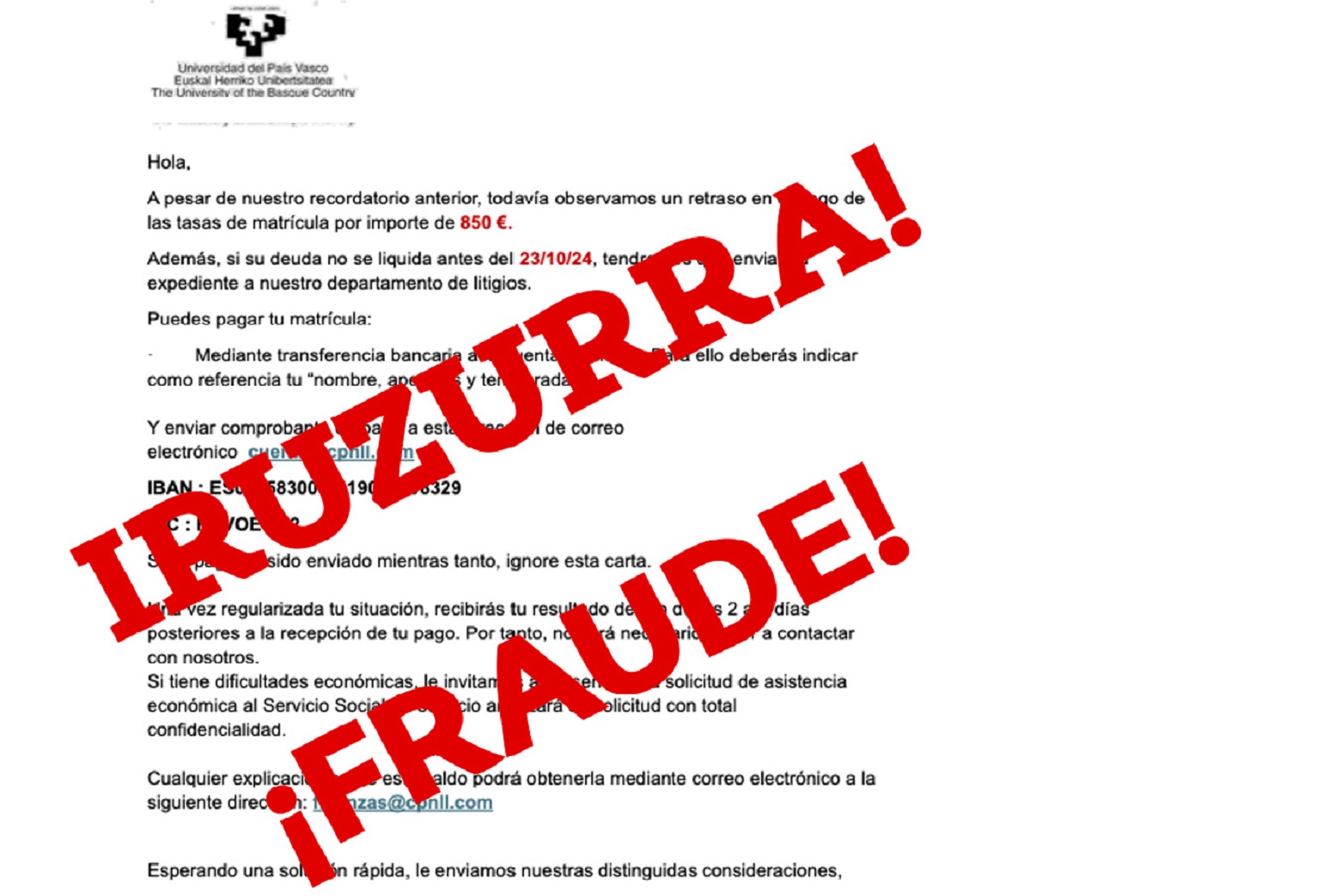 Importante: La Universidad del País Vasco advierte de un nuevo intento de fraude