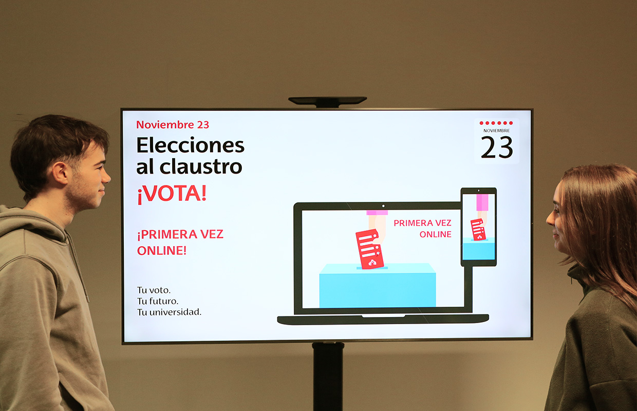 Dentro de una semana, el 23 de noviembre, toda la comunidad universitaria está llamada a votar en las elecciones al Claustro, pero esta vez no habrá urnas en los centros: por primera vez votaremos online. Hoy mismo, ya puedes consultar las candidaturas. Y el próximo jueves, vota. De 9:00 a 18:00, desde un ordenador, teléfono móvil u otro dispositivo, vota.