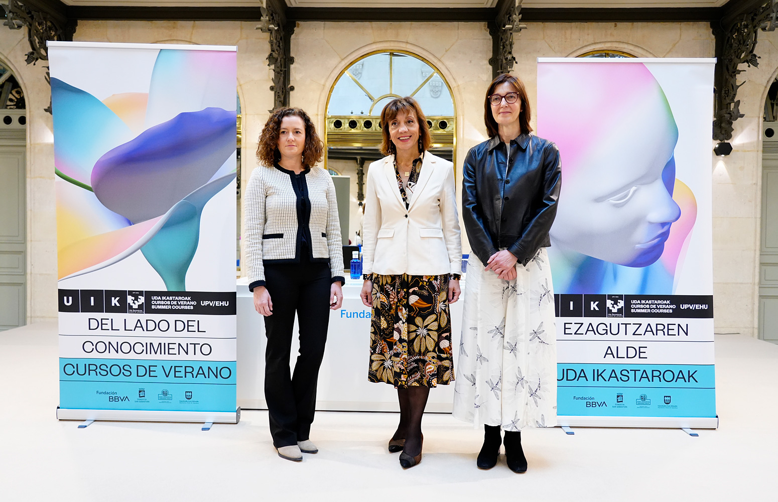 Se ha presentado la 43 edición de los Cursos de Verano de la UPV/EHU en la sede de la Fundación BBVA en Bilbao. Eva Ferreira, rectora de la UPV/EHU, Laura Poderoso, subdirectora de la Fundación BBVA, e Itziar Alkorta, directora académica de los Cursos de Verano, han desgranado todos los detalles de la presente edición.