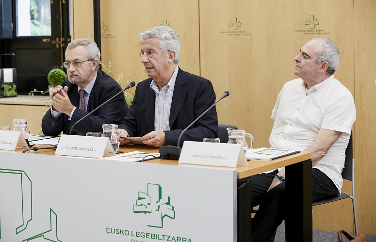 El acto contó con la participación de la presidenta de la Cámara Vasca, Bakartxo Tejeria, y de los profesores de Historia Contemporánea de la UPV/EHU José Luis de la Granja y Antonio Rivera, además del autor del libro.
