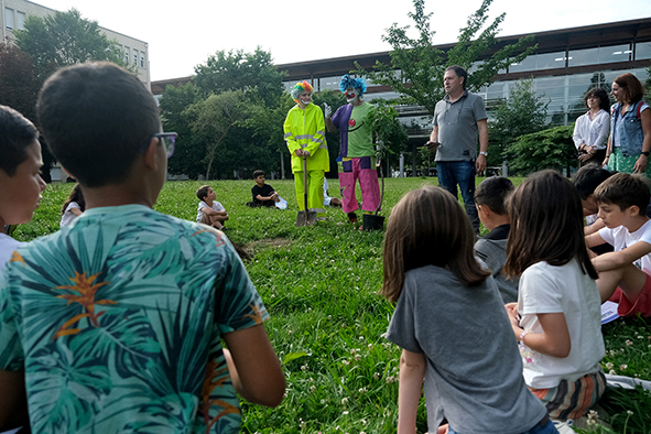 Porrotx, Marimototx, y dos IkasLagun, Amets el jardinero y Lua la violinista, junto con Joana Miguelena y Joxe Garmendia, les dieron la bienvenida. Foto: Nagore Iraola. UPV/EHU