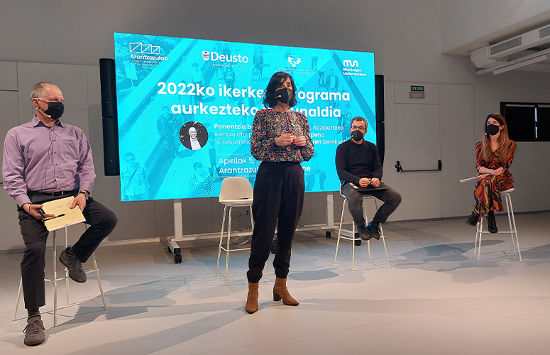 Arantzazulab ha presentado el Programa de Investigación de 2022 en Gandiaga Topagunea (Oñati), sede del laboratorio, en colaboración con investigadores de la Universidad del País Vasco, la Universidad de Deusto y Mondragon Unibertsitatea. Los asistentes al evento, se han reunido en el auditorio Oteiza del edificio. Además, como la presentación se ha ofrecido en directo a través de Zoom, un buen número de personas han presenciado el acto mediante esta plataforma online.