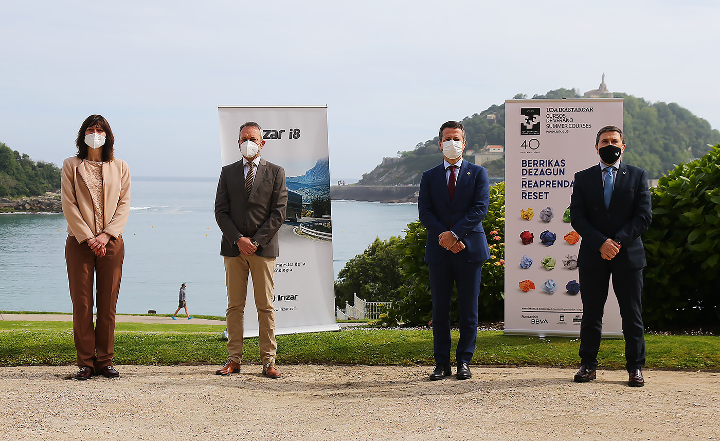 El Palacio Miramar, en Donostia / San Sebastián, ha sido el escenario de la presentación, bajo el lema ‘Reaprendamos’, de la 40 edición de los Cursos de Verano de la Universidad del País Vasco por parte de Jokin Bildarratz, consejero de Educación del Gobierno Vasco, Agustin Erkizia, vicerrector del Campus de Gipuzkoa de la UPV/EHU, Roberto Iñiguez de Onsoño, director de Personal de IRIZAR, e Itziar Alkorta, directora de los Cursos de Verano de la UPV/EHU.