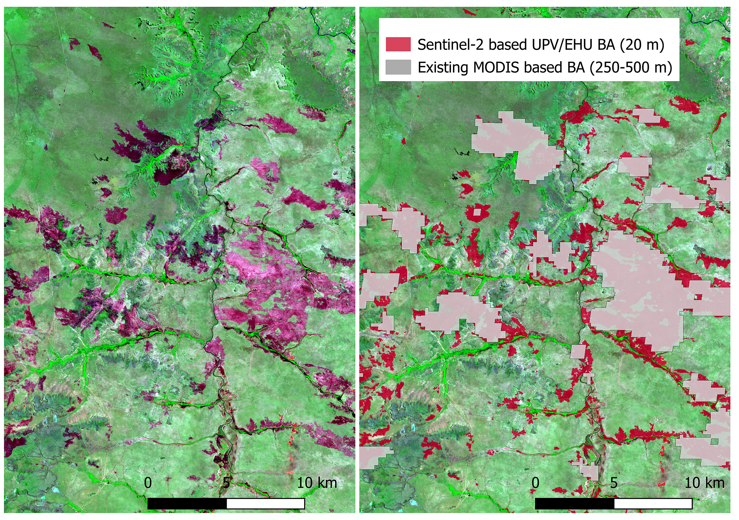El problema de las zonas cartografiadas mediante satélites se encuentra en la resolución. De hecho, hasta ahora la resolución de las observaciones globales ha sido mala. “El error de omisión en los productos actuales es muy grande: muchas zonas que están realmente quemadas no se identifican como tales”, señala Aitor Bastarrika, investigador de la UPV/EHU. “Los sistemas actuales utilizan un tamaño de píxel de entre 250 y 500 metros, por lo que no detectan incendios que no alcancen los 250 metros. Y en algunos ecosistemas son muy frecuentes los incendios de esas dimensiones”.