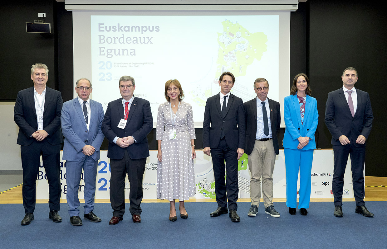 Euskampus Bordeaux Eguna 2023 ha sido inaugurado la rectora de la Universidad del País Vasco Eva Ferreira y el presidente de la Universidad de Burdeos Dean Lewis, además de los alcaldes de Bilbao y Burdeos, Juan Mari Aburto y Pierre Hurmic,;Adolfo Morais, viceconsejero de Universidades e Investigación del Departamento de Educación del Gobierno Vasco; Arola Urdangarin, directora de la agrupación Europea de Cooperación Territorial, Eurorregión Nueva-Aquitania-Euskadi-Navarra; Jesús Valero, director General de Tecnalia, y Javier Aizpurua, investigador del DIPC.