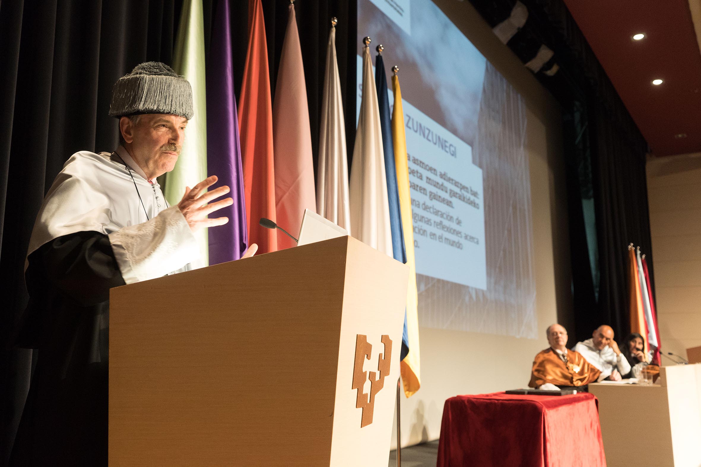 La ceremonia se ha realizado en el Aula Magna y ha sido presidida por la rectora de la UPV/EHU, Nekane Balluerka. El invitado de honor del acto de investidura ha sido el profesor Santos Zunzunegui Díez, doctor en Ciencias de la Comunicación, y que ha presentado la charla: Tres fechas y una declaración de intenciones: Algunas reflexiones acerca de la comunicación en el mundo contemporáneo.