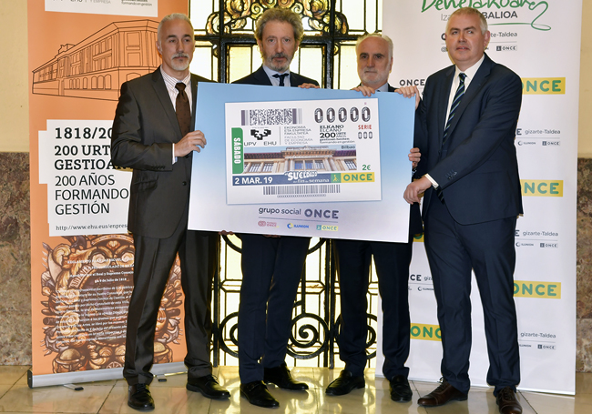 Los detalles del cupón fueron presentados en la propia Facultad de la mano del Delegado territorial de la ONCE en Euskadi, Juan Carlos Andueza; del Jefe de Juego de la ONCE en Euskadi y Cantabria, Miguel Morado; del Decano de la Facultad, Jon Barrutia; y del Vicedecano Coordinador de Elcano Pedro M. Gómez.
