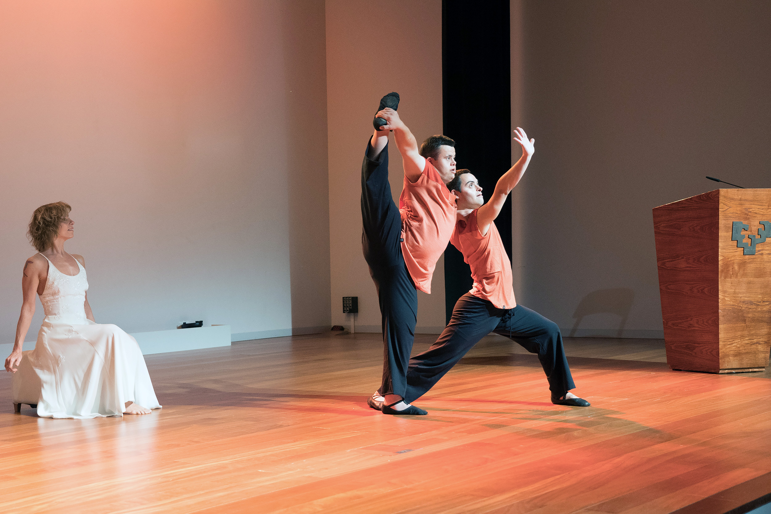 El acto, celebrado la sala Mitxelena, comenzó con la actuación de Verdini Dantza Taldea, la compañía de danza moderna que cuenta en sus filas con bailarines con síndrome de Down y otras discapacidades. En esta ocasión, el grupo estaba compuesto por dos bailarines y una bailarina.