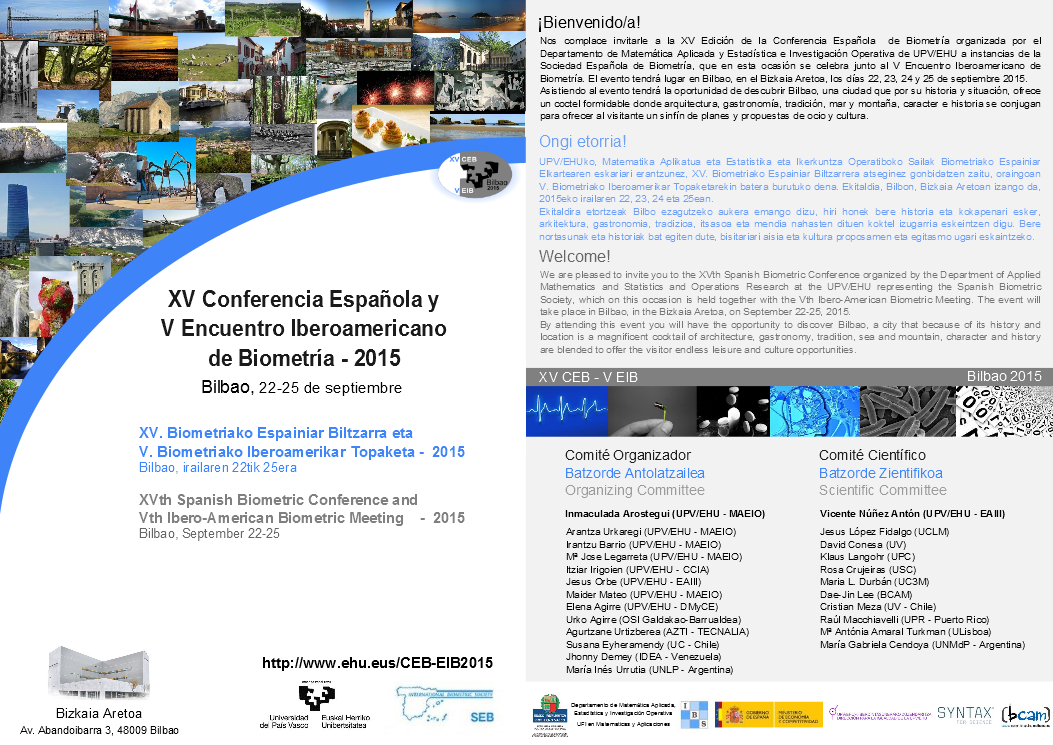 ¡Bienvenido! Nos complace invitarle a la XV Edición de la Conferencia Española de Biometría organizada por el Departamento de Matemática Aplicada y Estadística e Investigación Operativa de UPV/EHU a instancias de la Sociedad Española de Biometría, que en esta ocasión se celebra junto al V Encuentro Iberoamericano de Biometría. El evento tendrá lugar en Bilbao, en el Bizkaia Aretoa, los días 22, 23, 24 y 25 de septiembre de 2015. Asistiendo al evento tendrá la oportunidad de descubrir Bilbao, una ciudad que por su historia y situación, ofrece un coctel formidable donde arquitectura, gastronomía, tradición, mar y montaña, caracter e historia se conjugan para ofrecer al visitante un sinfín de planes y propuestas de ocio y cultura.