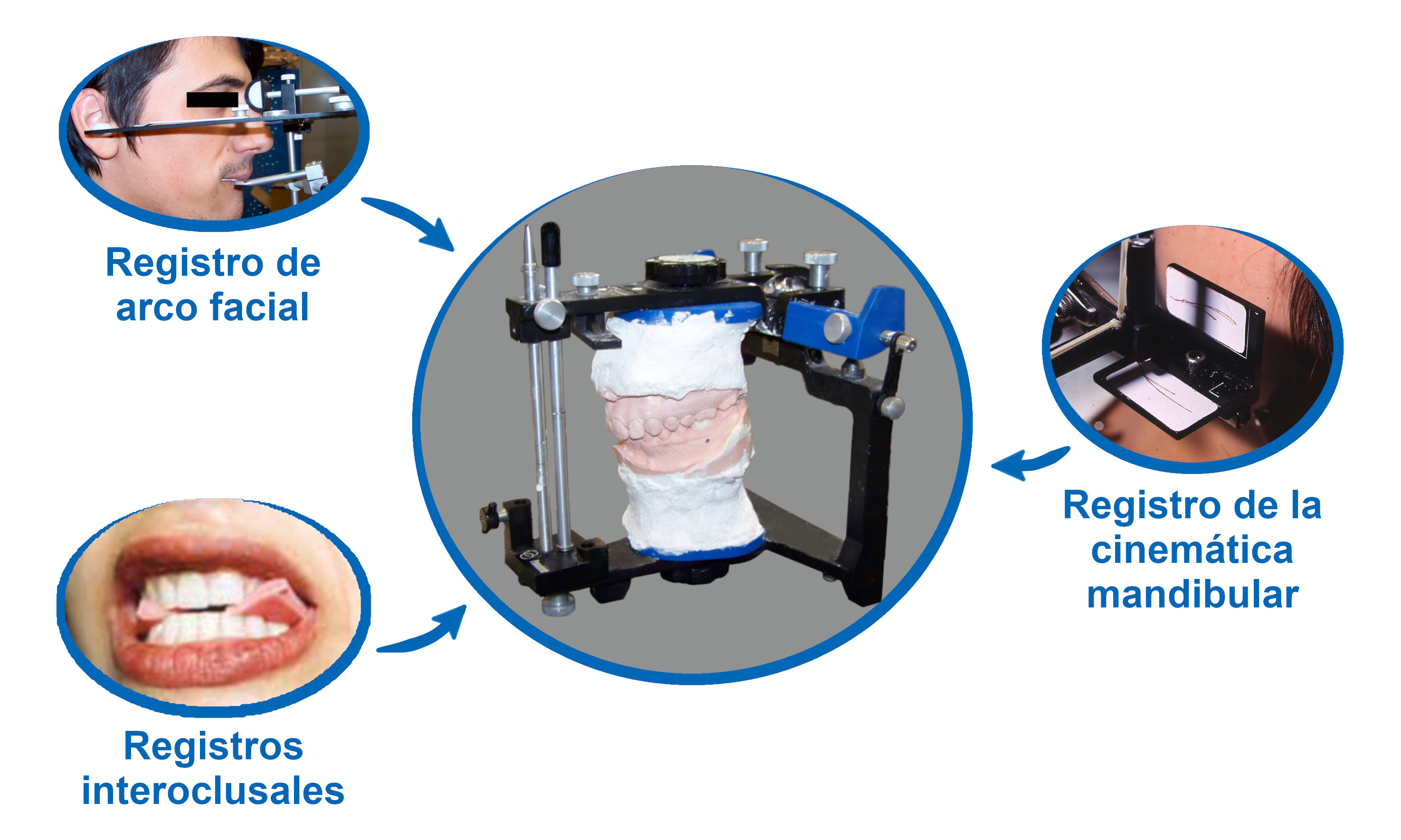 En la odontología protésica y restauradora tanto por motivos técnicos y de comodidad como para poder prever los resultados, para la evaluación de la oclusión y para la elaboración de prótesis dentales y restauraciones dentales indirectas, las réplicas de yeso de las arcadas dentales (modelos de yeso) de los pacientes se montan en instrumentos mecánicos llamados articuladores. Estos articuladores mecánicos, según el glosario The Glossary of Prosthodontic Terms (novena edición), son instrumentos mecánicos que representan las articulaciones temporomandibulares y los maxilares, a los que se pueden fijar los modelos de yeso de las arcadas dentales maxilares y mandibulares para simular algunos o todos los movimientos mandibulares. Durante los años, conforme se adquirieron mayores conocimientos sobre la anatomía, los movimientos mandibulares y los principios mecánicos, se fueron desarrollando articuladores mecánicos que simulaban de manera más exacta los movimientos mandibulares. Para poder simular los movimientos mandibulares de cada paciente de manera más exacta, estos articuladores mecánicos se ajustan mediante diferentes registros tomados del paciente como son los registros interoclusales, el registro de arco facial y el registro de la cinemática mandibular (figura 1).