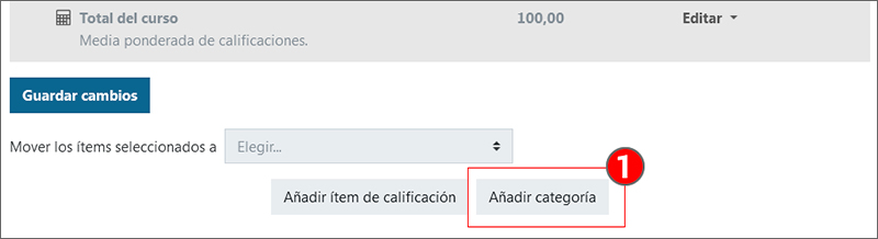 Después de guardar esta configuración, se vuelve al apartado “Configuración Calificaciones” y en la parte inferior pulsa sobre “Añadir categoría” (1).