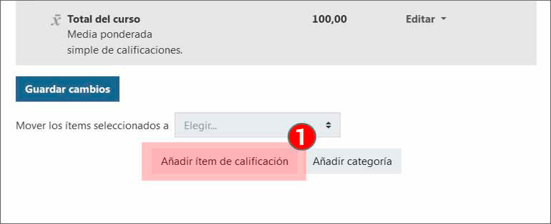 En la parte inferior de la página “Configuración calificaciones”, pulsar sobre “Añadir ítem de calificación” (1).