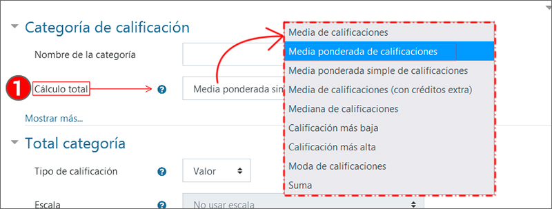 Como primer paso, se accede al apartado “Configuración Calificaciones” y se modifica el método de cálculo del curso para poder establecer pesos entre las categorías en el campo “Cálculo total”, como se ha mostrado en el apartado anterior.