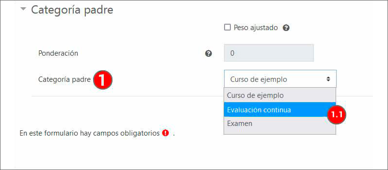 En el apartado “Categoría padre” (3) se puede escoger que la categoría creada pertenezca a una categoría distinta de la categoría superior o curso. En la imagen siguiente, se muestra cómo la categoría "Evaluación continua sin peso" se guarda en el menú desplegable “Categoría padre” (1) como subcategoría de “Evaluación continua” (1.1).