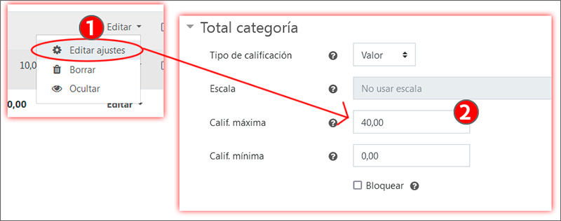 Para modificar la calificación máxima de una categoría, pulsar sobre “Editar” para desplegar el menú y, a continuación, sobre “Editar ajustes”. En el campo “Calif. Máxima” (2) insertar el valor deseado.