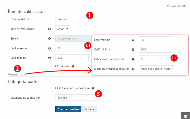 Además, desplegando las opciones avanzadas (2), hay más campos como el “Número ID”, las opciones para “Ocultar”. En la captura sobre-expuesta sobre la imagen se muestra solo una parte de este apartado. En esta sección se ha modificado la “Calificación para aprobar” (2.1), establecida por defecto en 0.