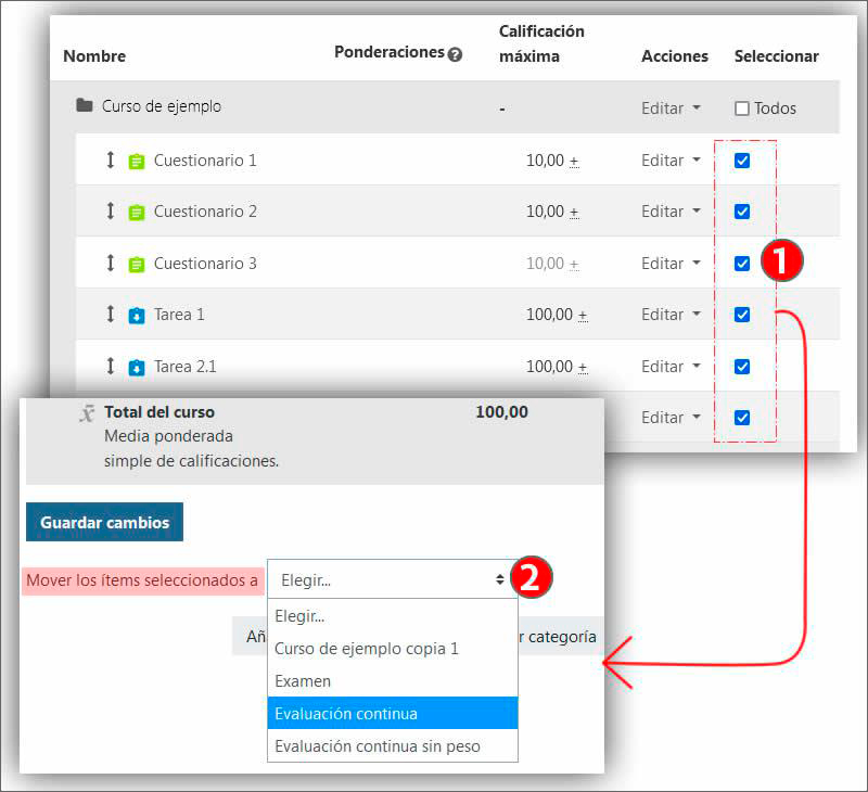 Después de crear las categorías, las actividades pueden seleccionarse en la columna “Seleccionar” y guardarse en la categoría elegida en el desplegable “Mover los ítems seleccionados a” (2).