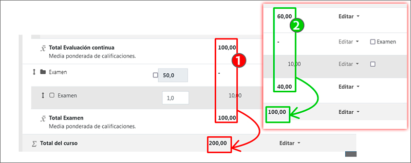 El método de cálculo “Suma” permite otra opción para establecer los pesos relativos de las categorías de un curso. En este caso, es necesario tener en cuenta que el total del curso se ajusta a la suma de los totales de las categorías del curso. En el caso del ejemplo presentado y manteniendo los valores anteriores (1), los totales de las categorías “Evaluación continua” (100) y “Examen” (100) suman 200.