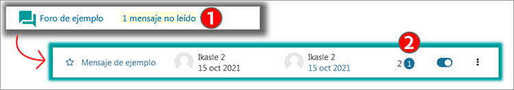 • “Rastreo del foro” (2.4, en la imagen anterior) muestra el número de mensajes no leídos de un foro (1) y el número de mensajes no leídos por cada hilo (2).