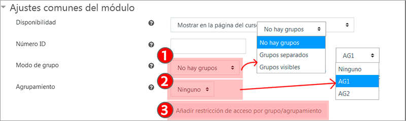 Además, en el campo “Agrupamiento” (2) se puede elegir un agrupamiento, si se ha creado previamente. De esta manera, la división en grupos que se aplica en la actividadsolo tiene en cuenta los grupos incluidos en dicho agrupamiento.